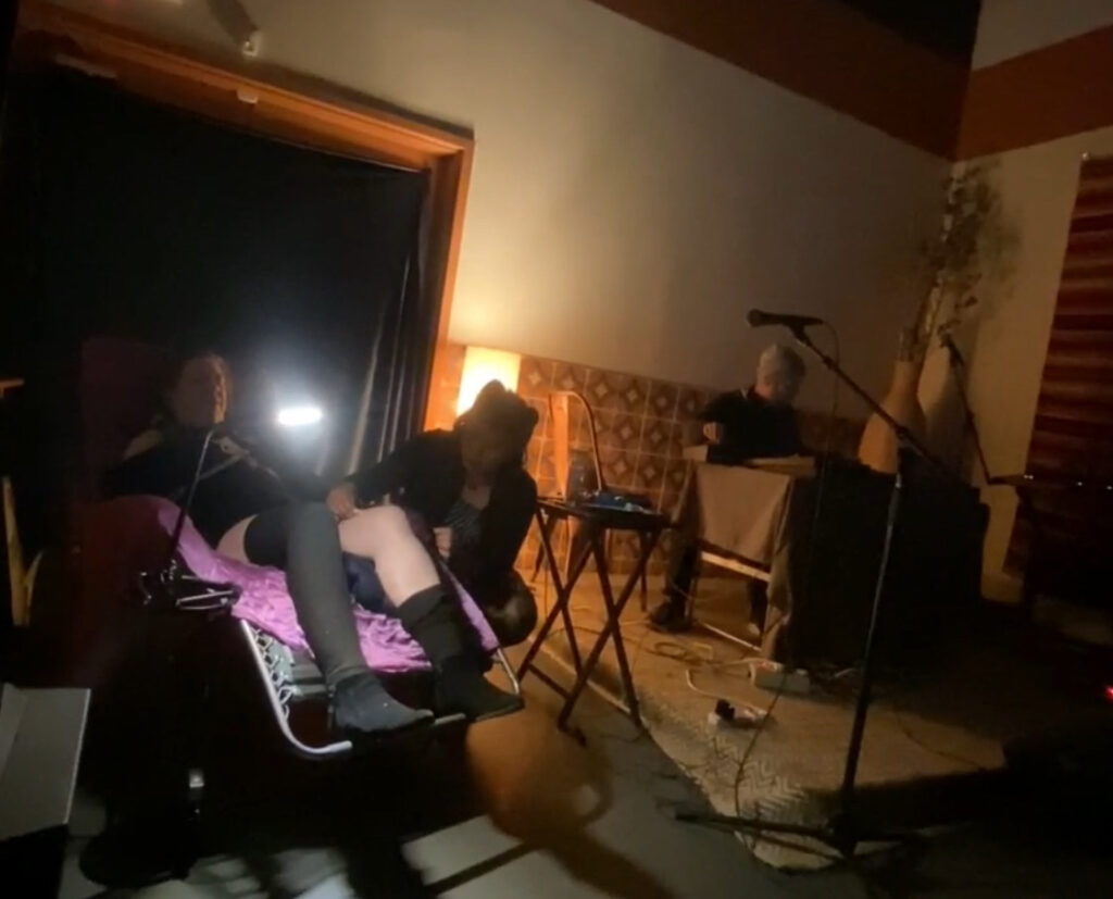 My main project right now is called the Dale X Mothfur Collab with XEELA-phone. We are a music performance group merging acupuncture, sound, and nature together with a touch of retro-futurism. I go by Mothfur (Kit Garcia). I play the human instrument XEELA-phone (Sheilagh O’Hare) as well as sing and write lyrics. Sheilagh is given acupuncture live on stage which is the interface by which she produces sounds. The generated music is further modified by pedals and filters to shape the final product to which Dale Cannedy-Azim harmonizes to on his synths in real-time. Every performance is unique because Sheilagh’s physical state of being as well as emotions affect the sonic outcome. I would say our sound is a sort of auditory escapism that guides the participant into a hopeful and magical world of a benevolent future complete with playful aliens and sentient mushrooms. In the past, I have played guitar, ukulele, created sound baths, and sung in a variety of groups.